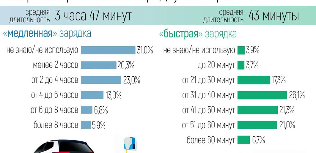 В среднем — 43 мин. Всего лишь 6,7% опрошенных расходуют на такую зарядку больше 1 часа.