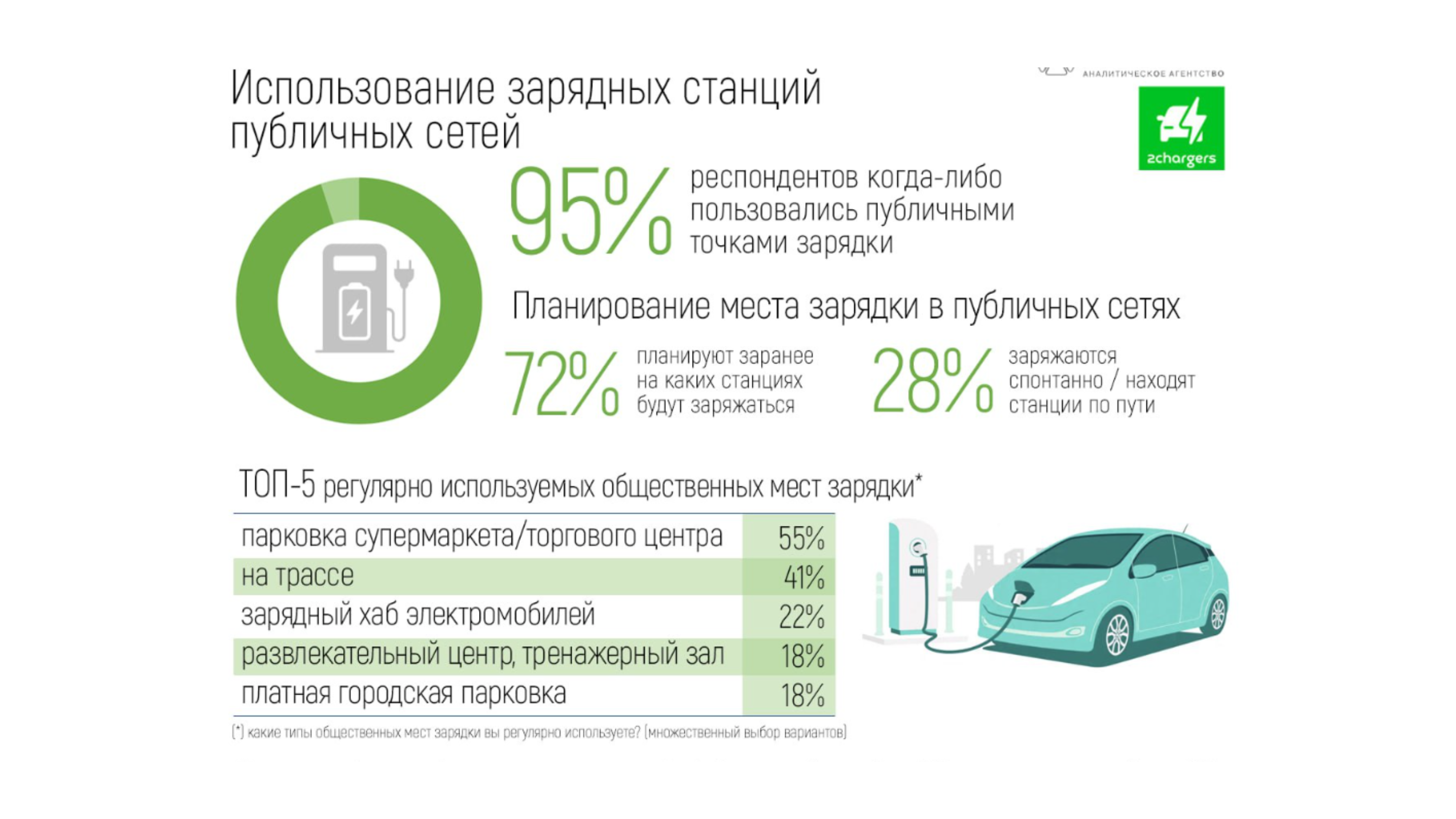 Коллеги из «Автостата» выяснили: 95% опрошенных владельцев электричек когда-либо пользовались публичными зарядными станциями (что неудивительно), при этом 55% электроводов заряжаются в торговых центрах, а станции зарядки на трассе получили второе место по популярности, обогнав специальные зарядные хабы.